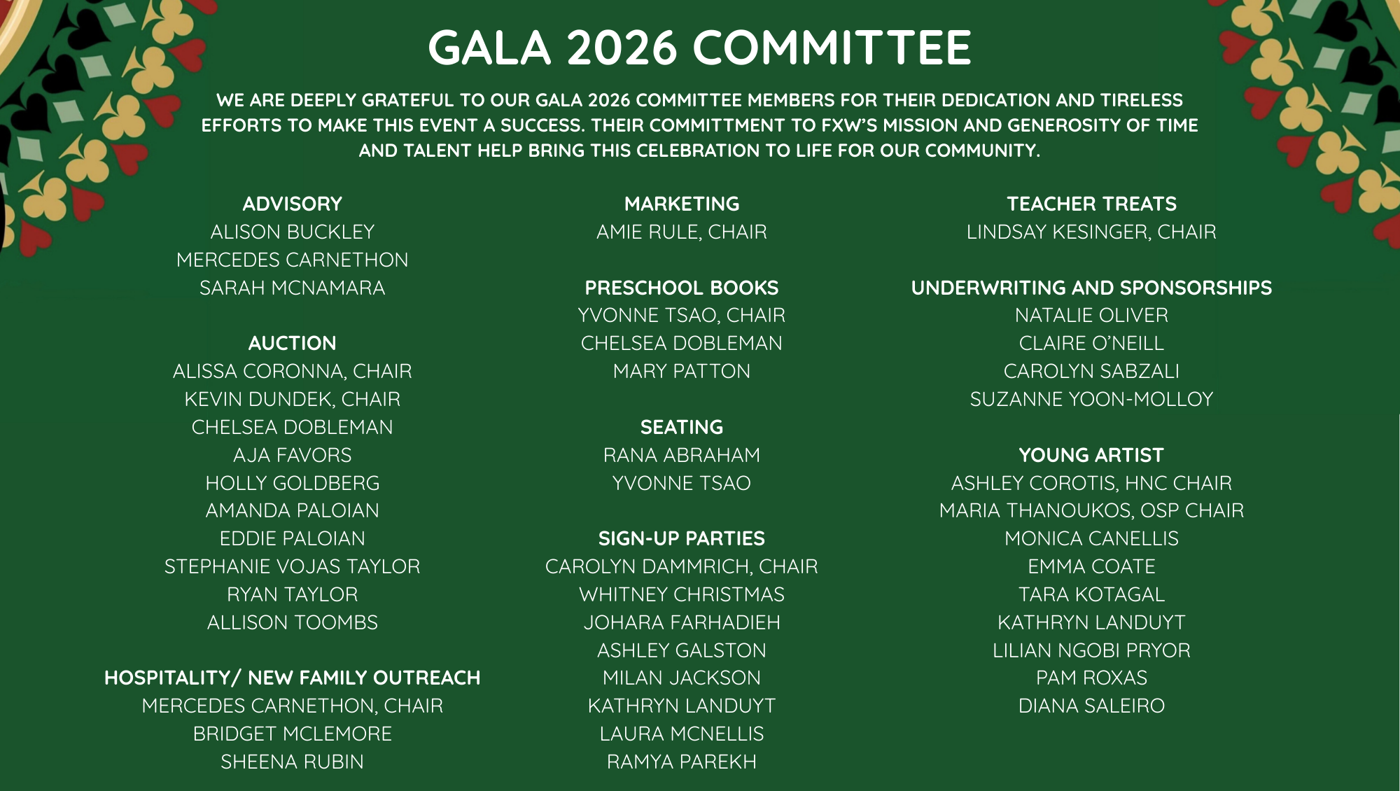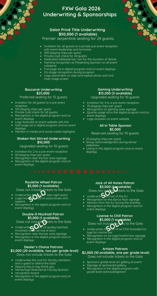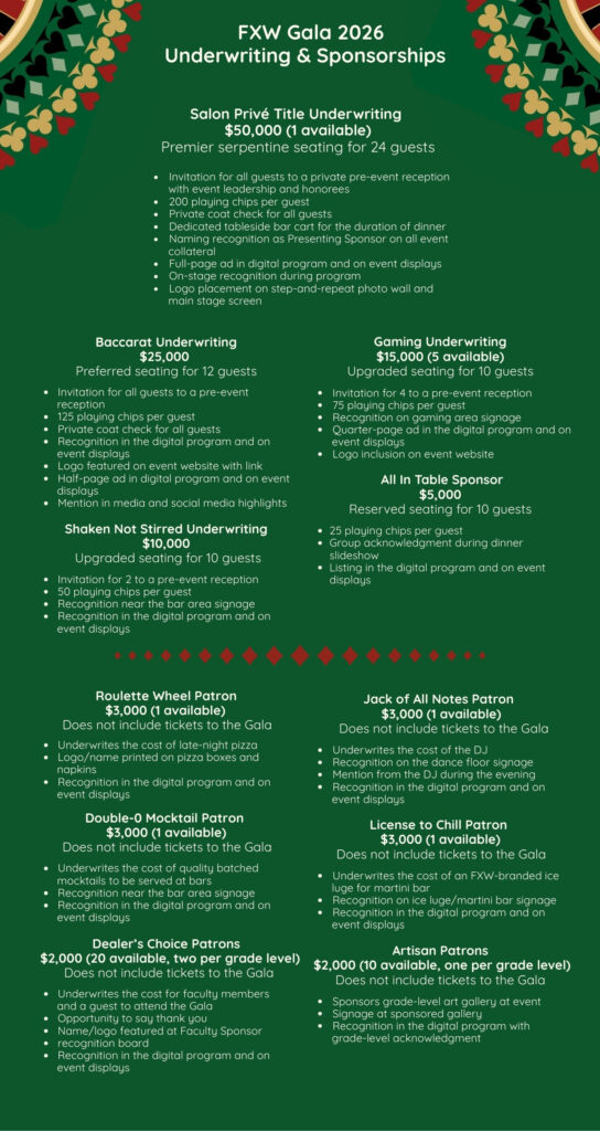 We are so excited for our “Casino Royale” Gala on Saturday, February 28, 2026 when we come together for for an unforgettable evening of dinner, dancing, and games—all in celebration of what makes FXW such a special community! The funds raised through the FXW Gala are essential to our school’s Mission, supporting annual expenses that directly impact every facet of student life. Each contribution helps sustain and grow the programs that make FXW a place where curiosity, creativity, and community come together.
