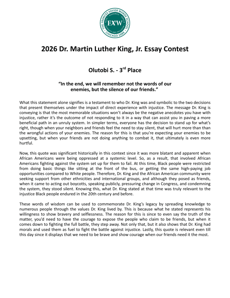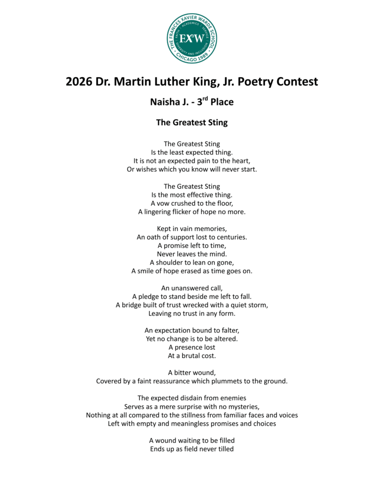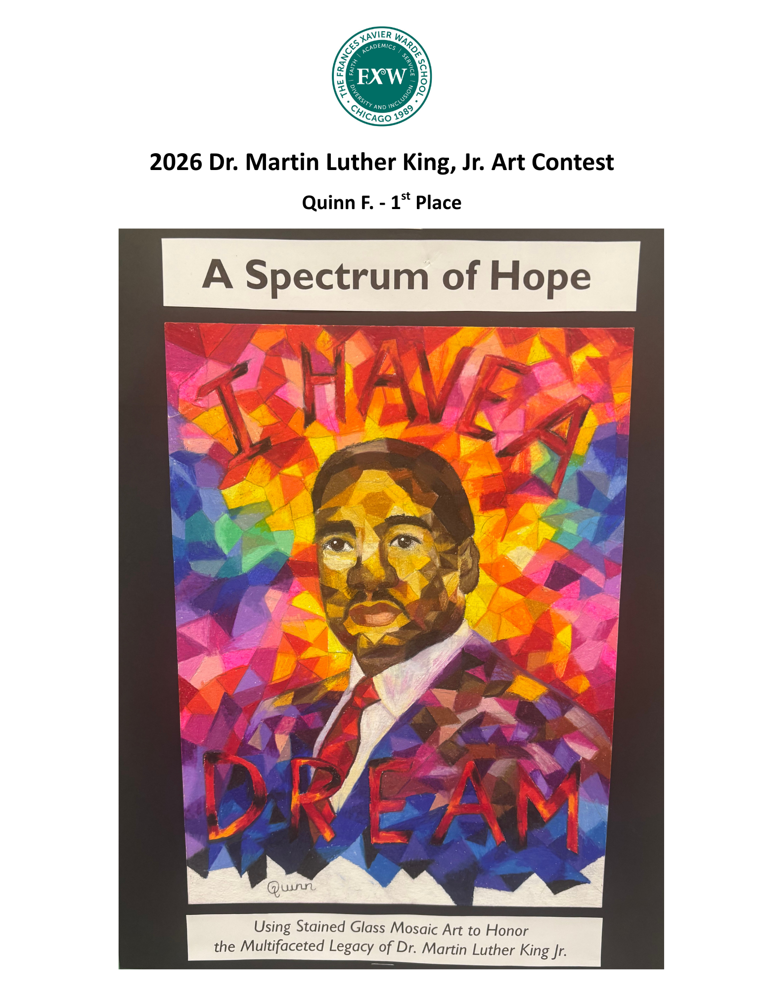 In honor and celebration of Dr. King’s legacy, The Frances Xavier Warde School invites students to submit entries into our annual art, essay, and poetry contests. The essay and poetry contests are open to Grade 6-8 students. The art contest is open to all FXW students.