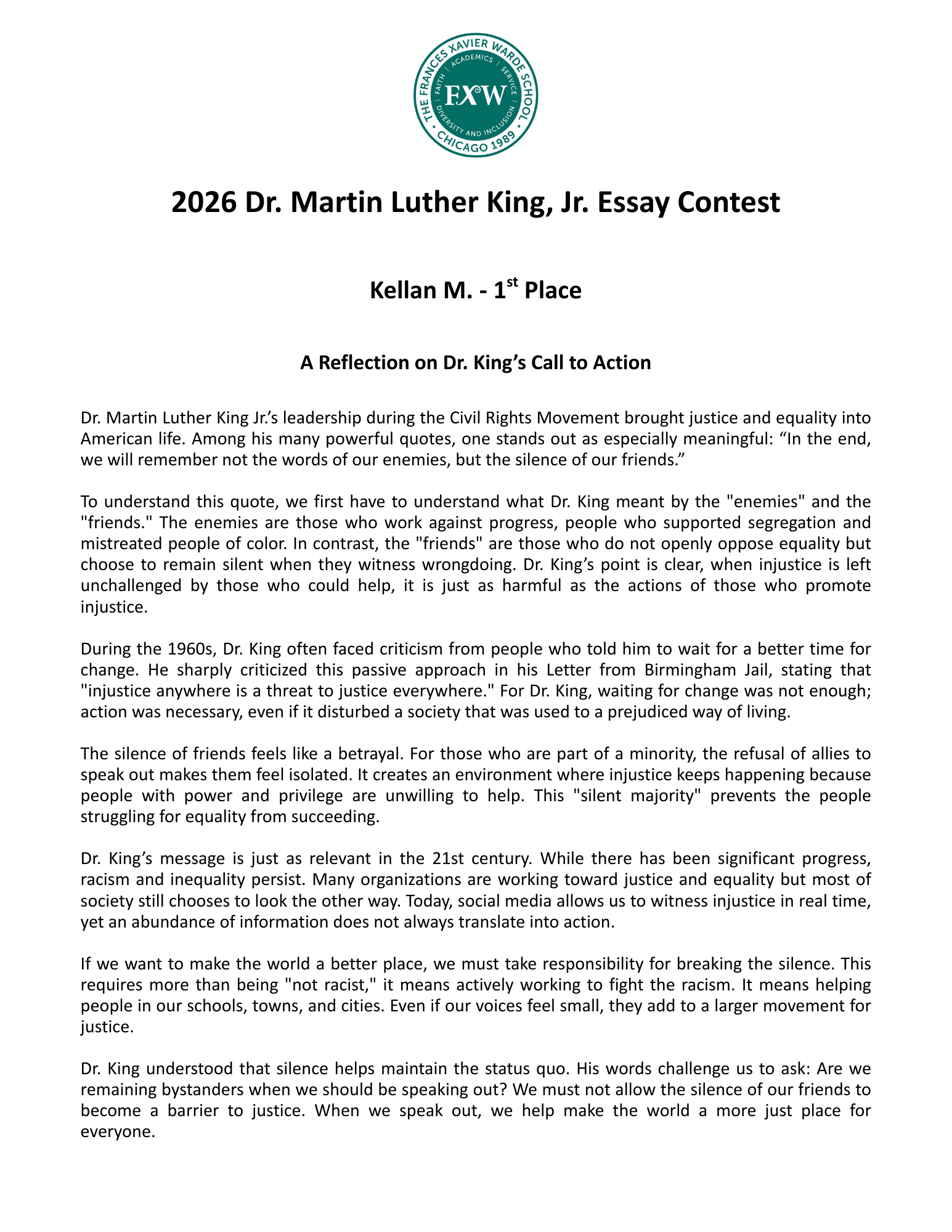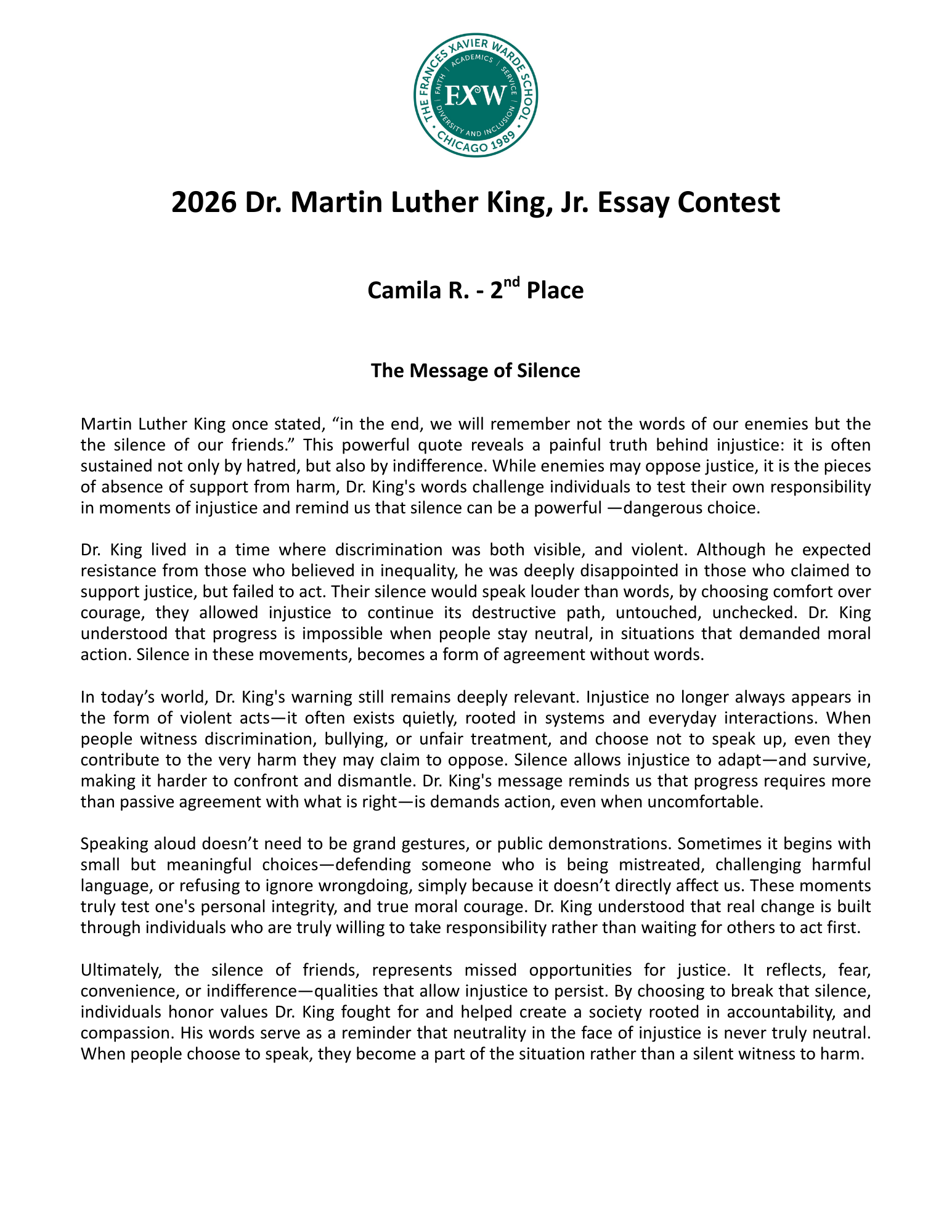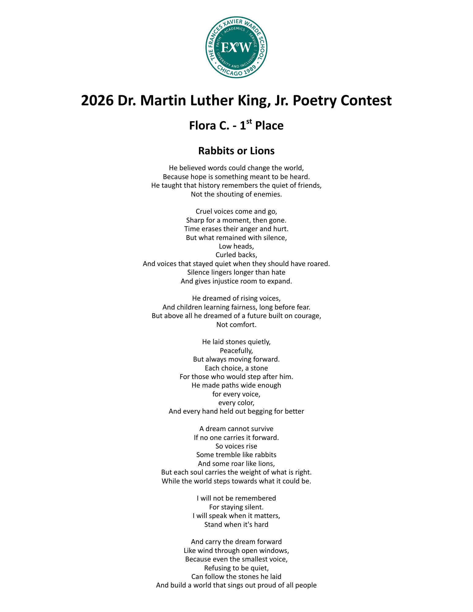 In honor and celebration of Dr. King’s legacy, The Frances Xavier Warde School invites students to submit entries into our annual art, essay, and poetry contests. The essay and poetry contests are open to Grade 6-8 students. The art contest is open to all FXW students.